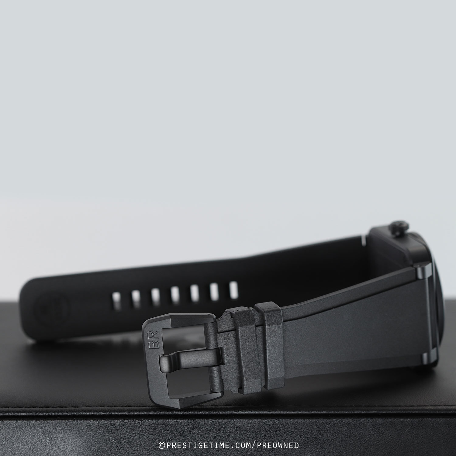 - Fitted on its original Bell & Ross black rubber strap with a stainless steel tang buckle. This strap is unworn in new condition with its full wear lifespan remaining.