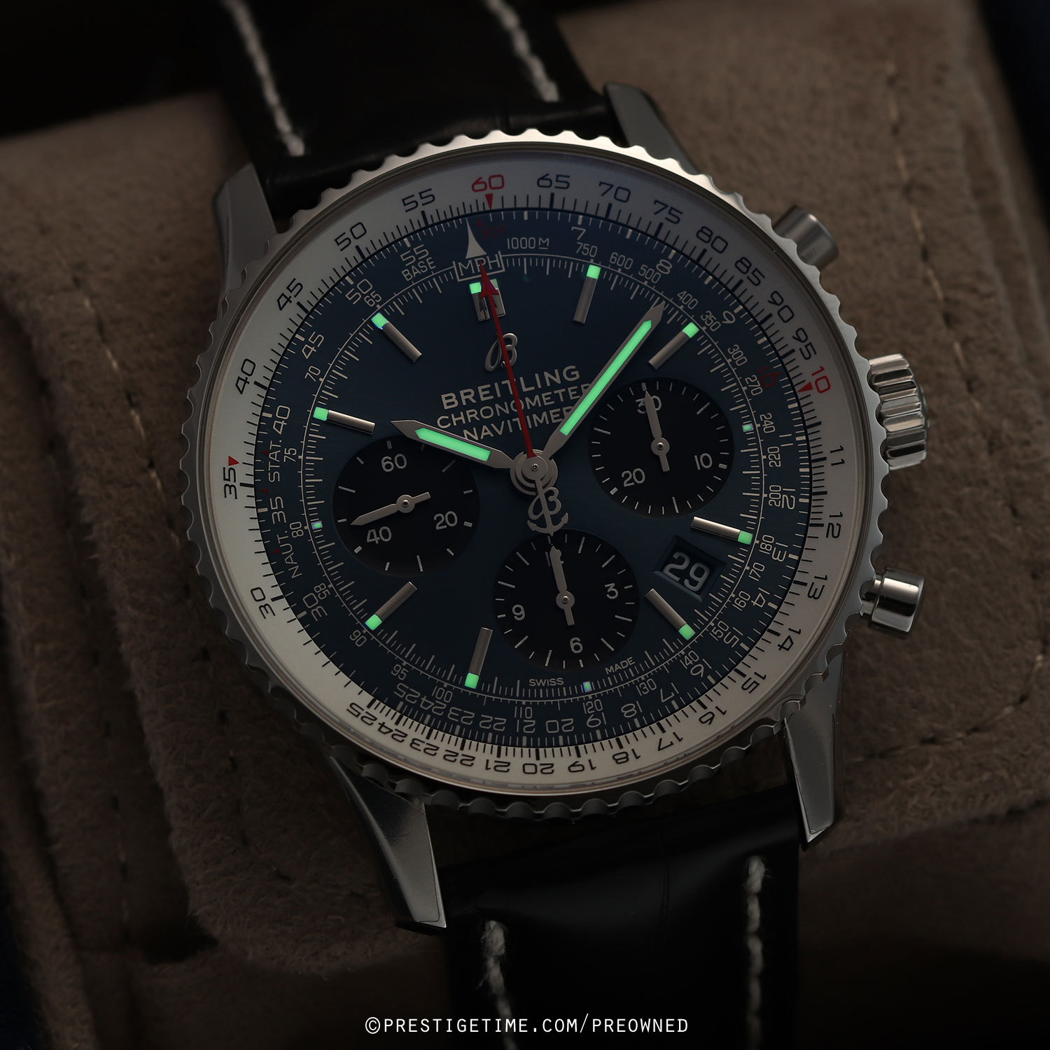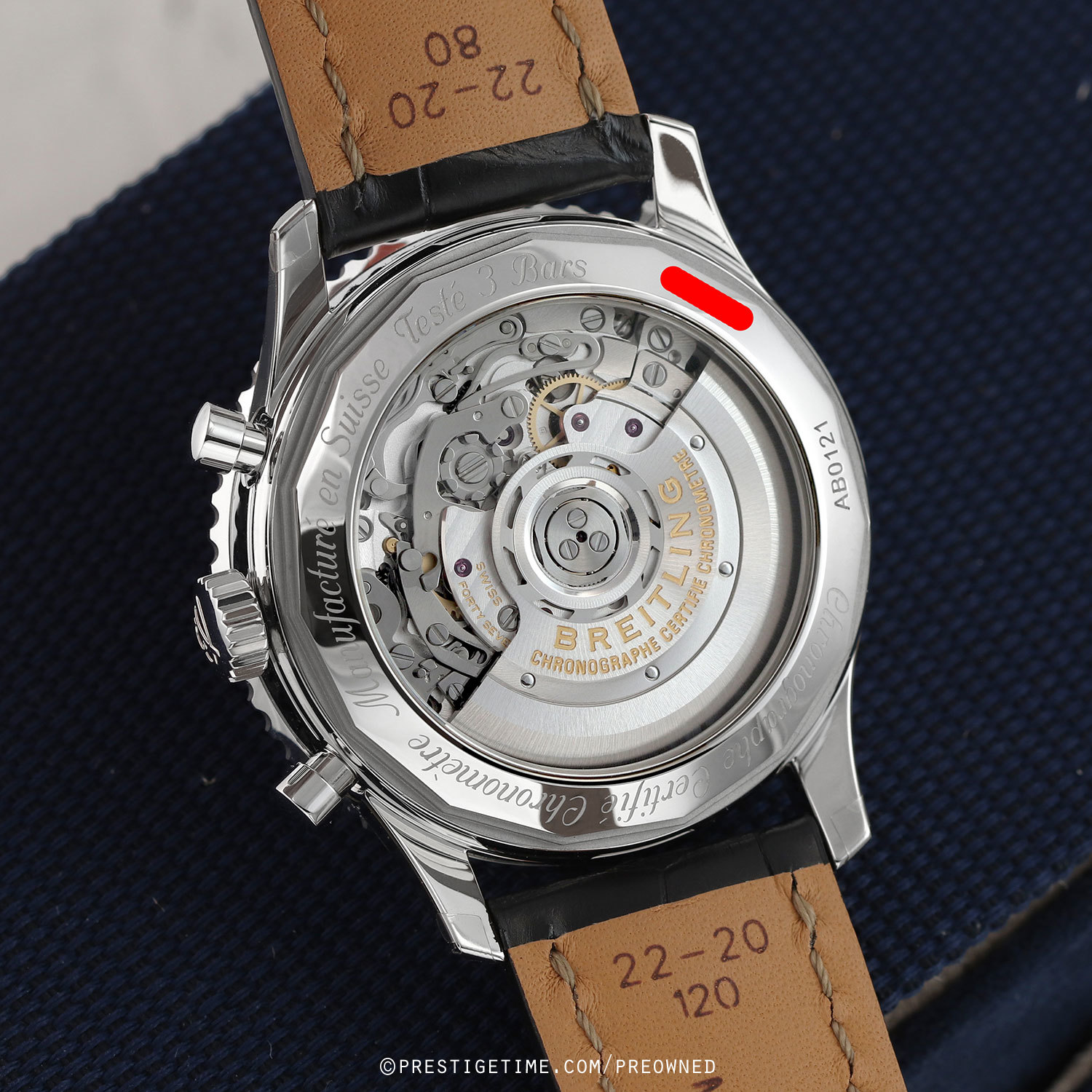 Movement: Powered by a Breitling in-house caliber 01, which beats at 28,000 vph (4Hz), contains 47 jewels, and has a power reserve of +/- 70 hours.