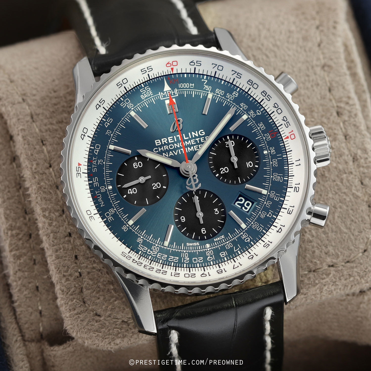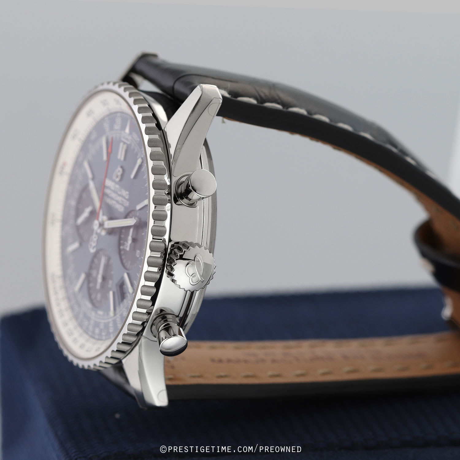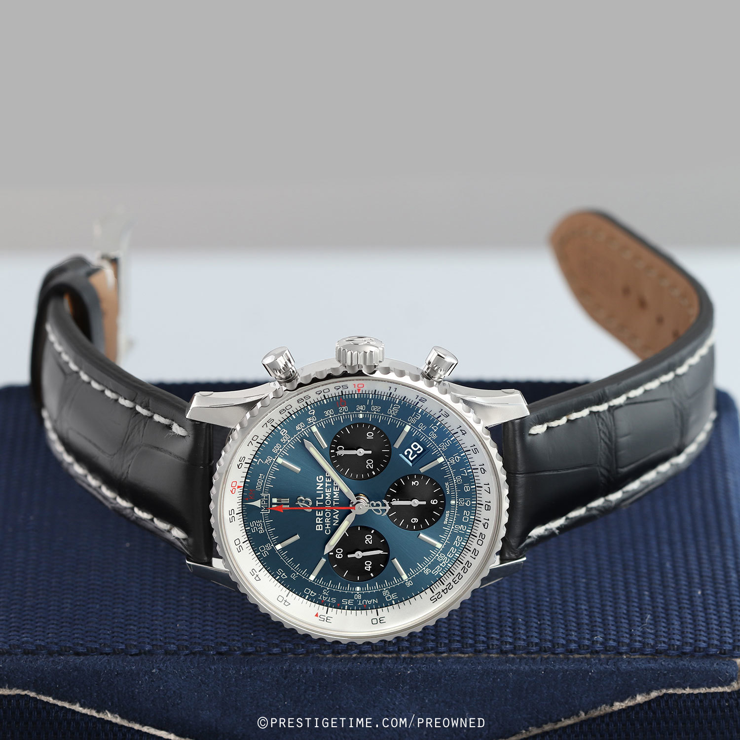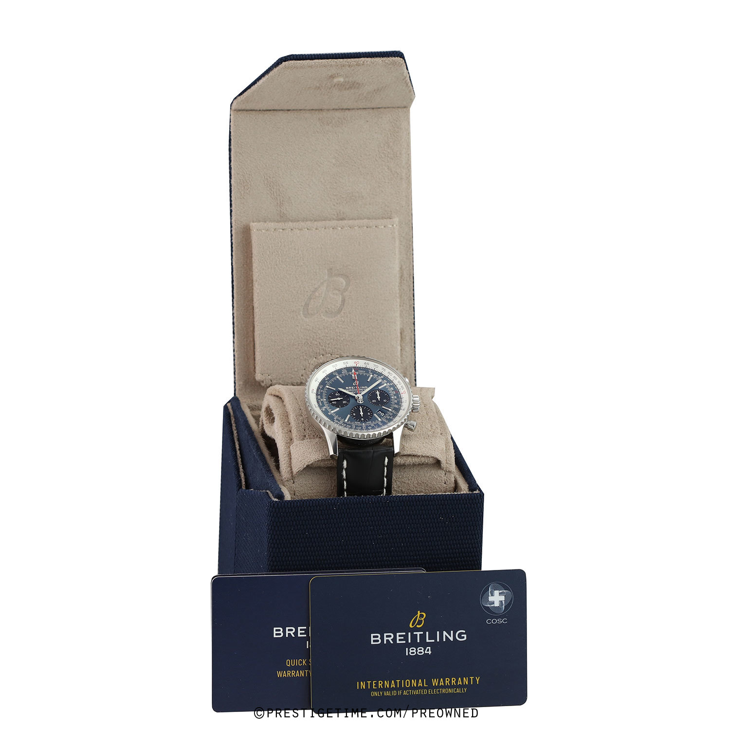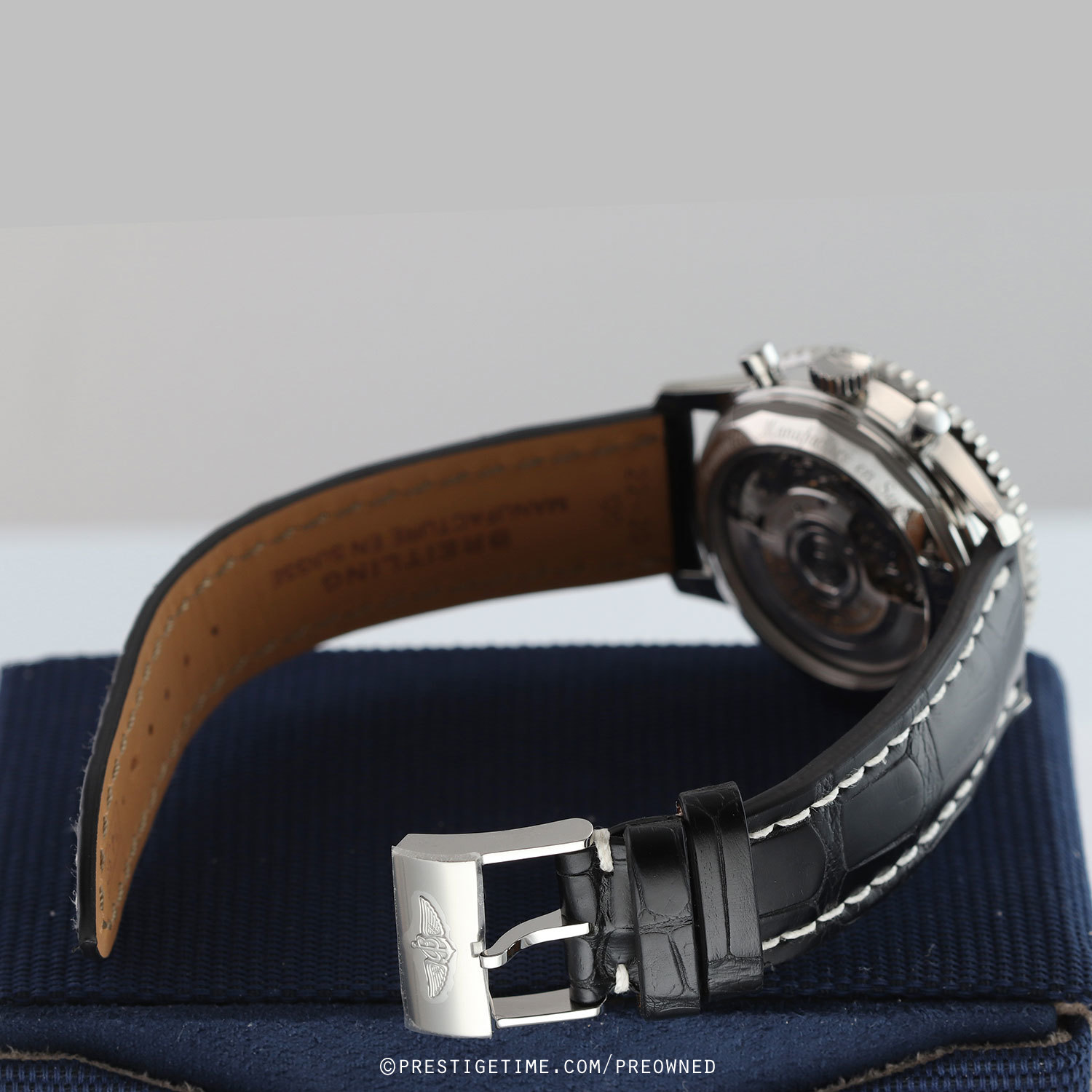 Strap: Fitted on its original Breitling black alligator leather strap with contrasting white stitching & a stainless steel tang buckle. The strap is unworn in new condition with its full wear lifespan remaining.