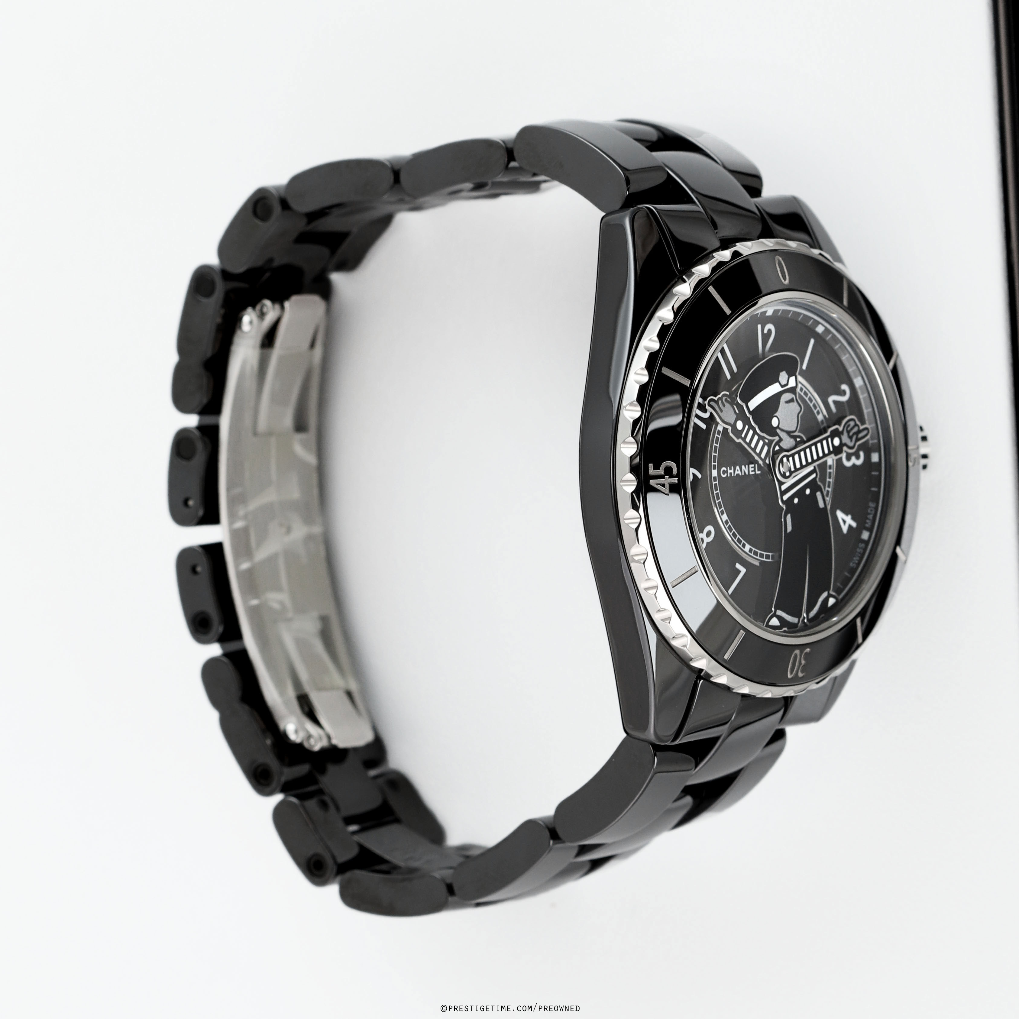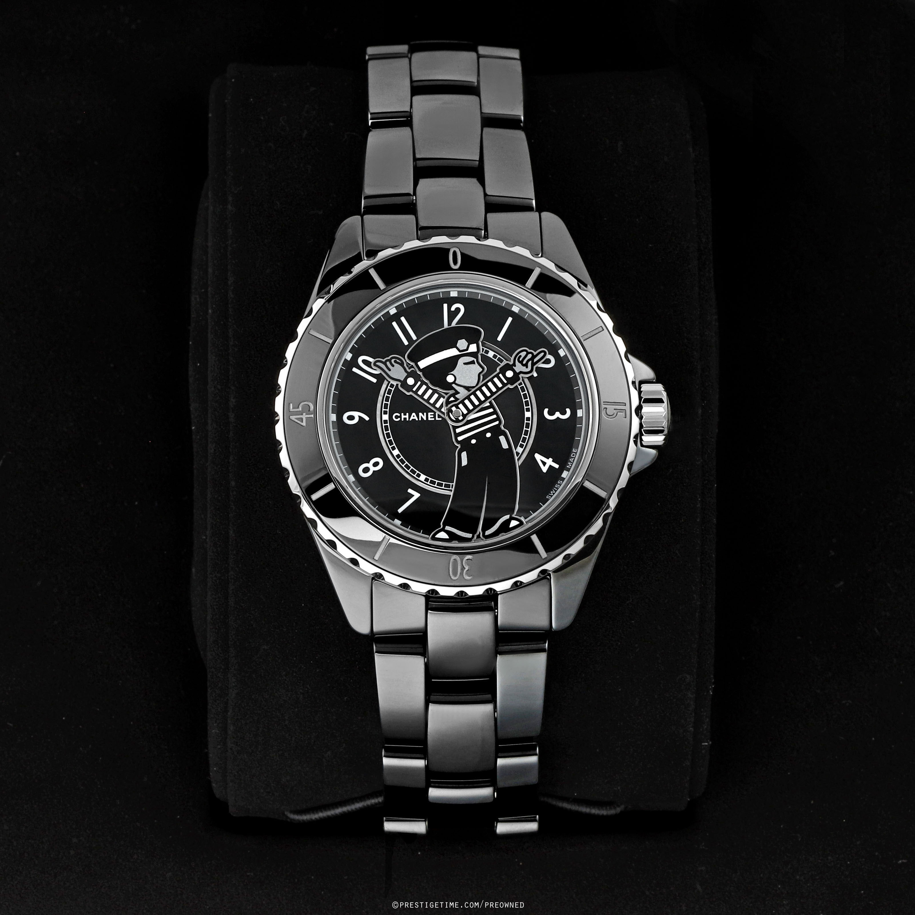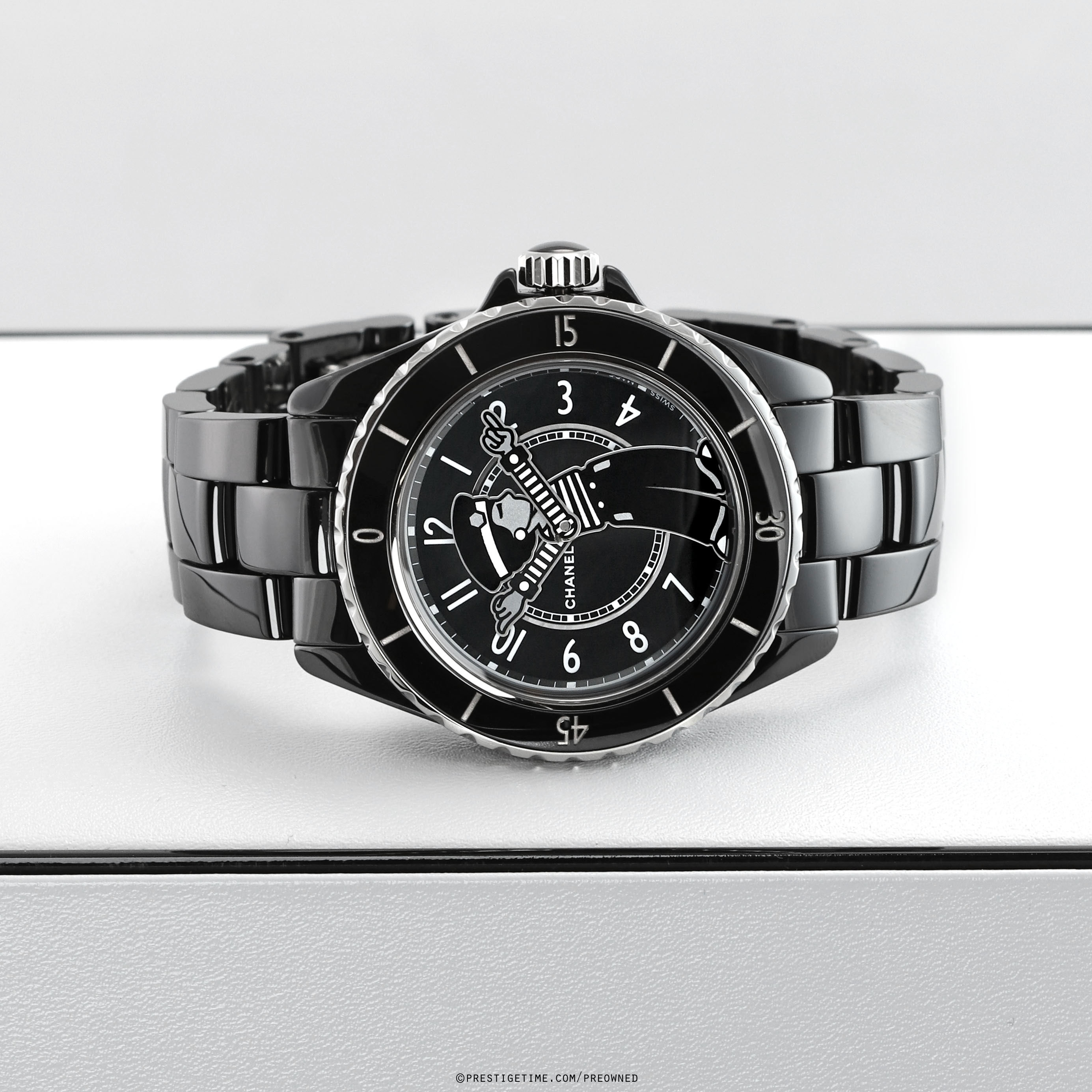 The Chanel Mademoiselle J12 La Pausa, limited edition (not numbered). A fun and creative tribute to Coco Chanel, this watch features a stylized portrait of Mademoiselle Chanel on the dial, while her arms mark the passage of time.