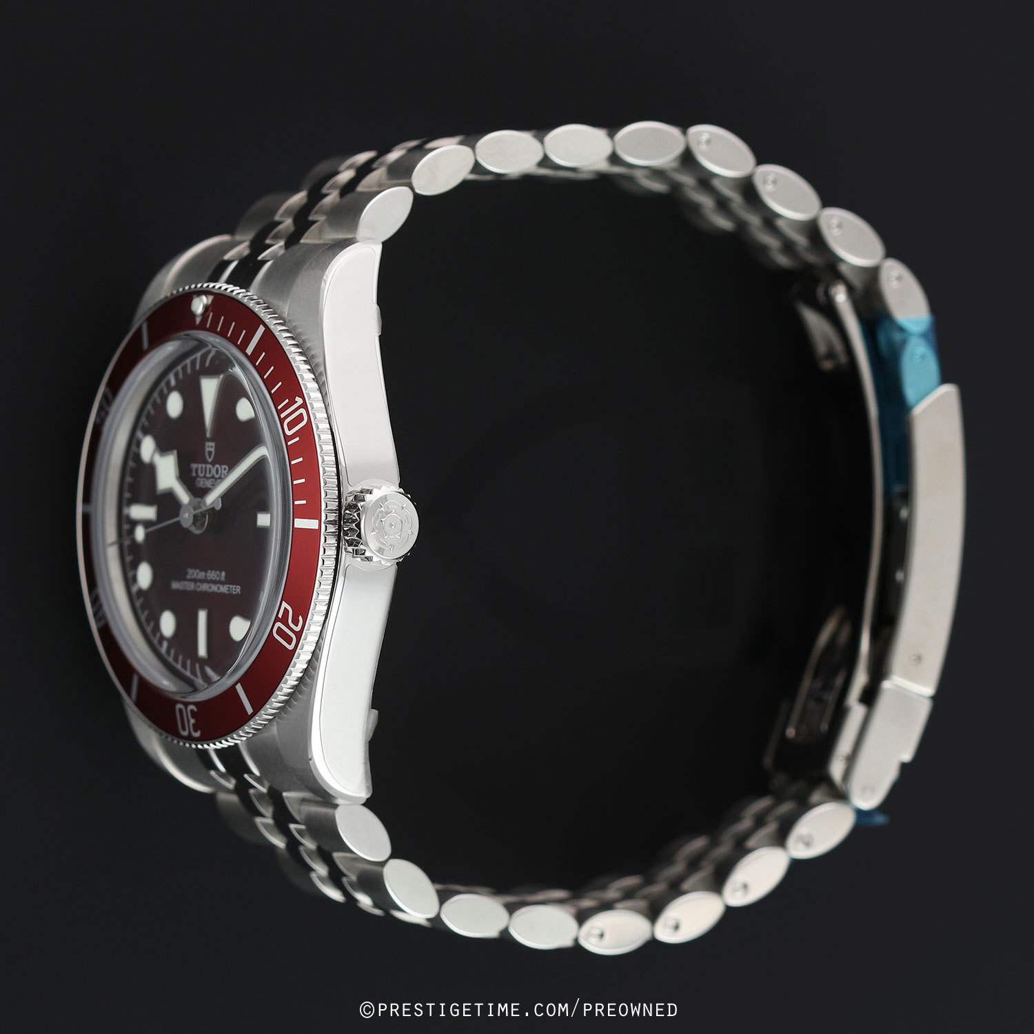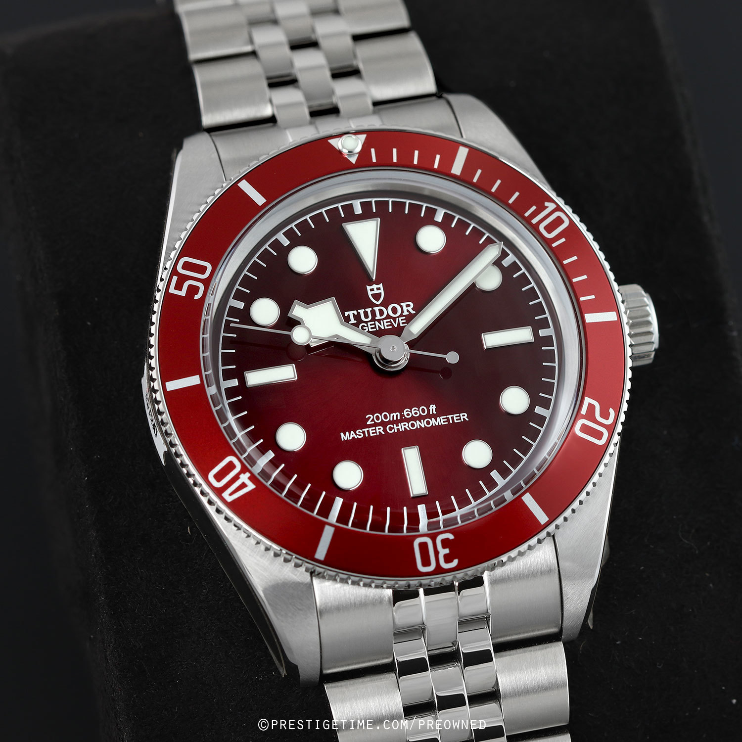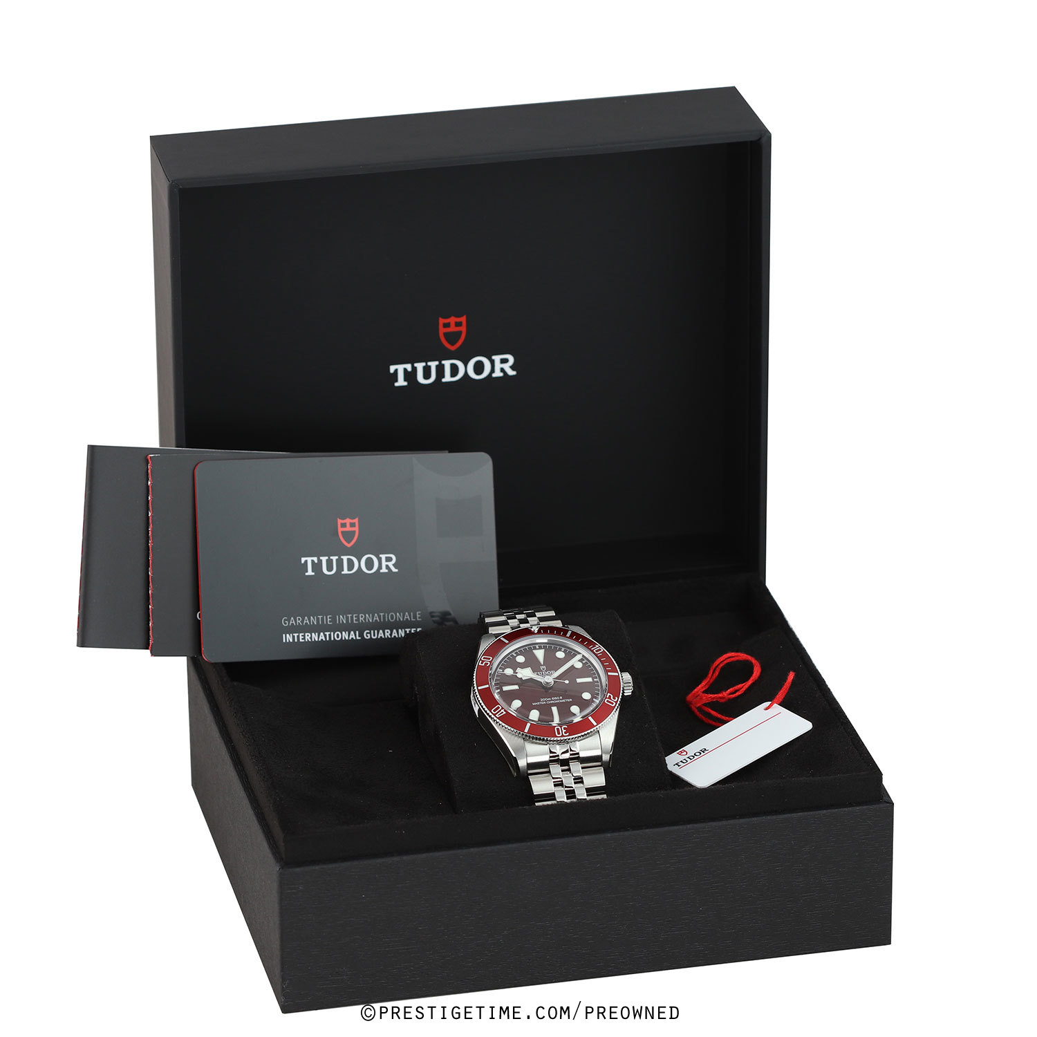Case: Brushed & polished stainless steel case. Burgundy aluminum bezel with 60 minute diving scale. Crown with the TUDOR rose engraved. Domed sapphire crystal. Slightly domed bright-burgundy dial. Polished angular 'snowflake' hands with luminous fill. Applied polished hour markers with luminous fill. Fine printed minute/seconds track.
