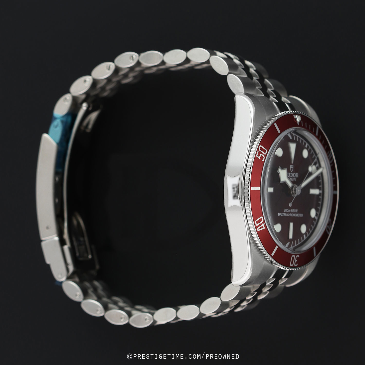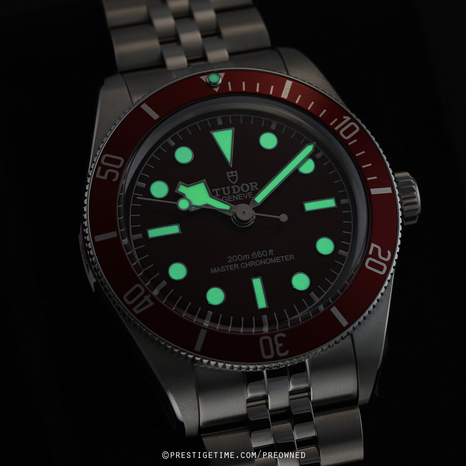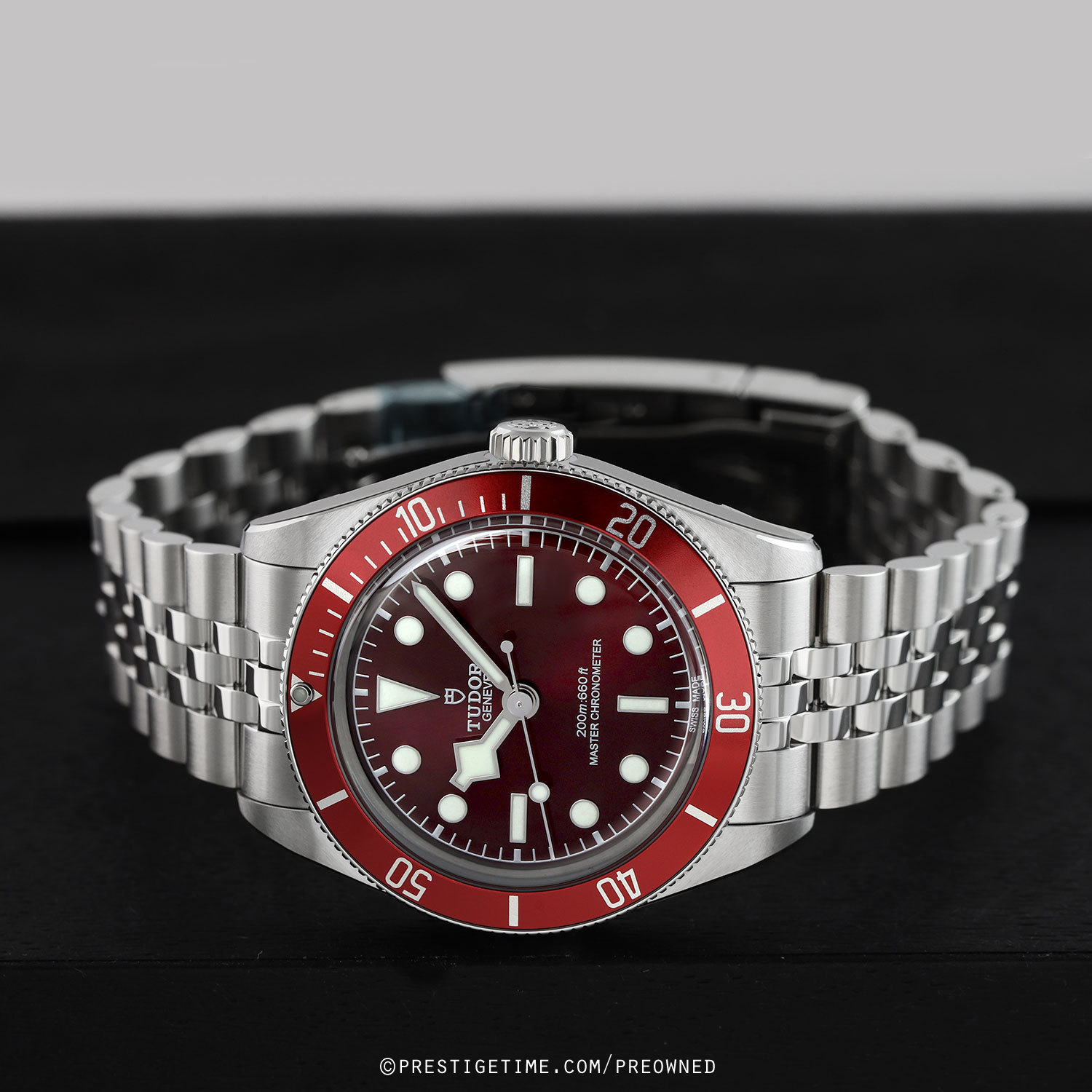 Case: Brushed & polished stainless steel case. Burgundy aluminum bezel with 60 minute diving scale. Crown with the TUDOR rose engraved. Domed sapphire crystal. Slightly domed bright-burgundy dial. Polished angular 'snowflake' hands with luminous fill. Applied polished hour markers with luminous fill. Fine printed minute/seconds track.