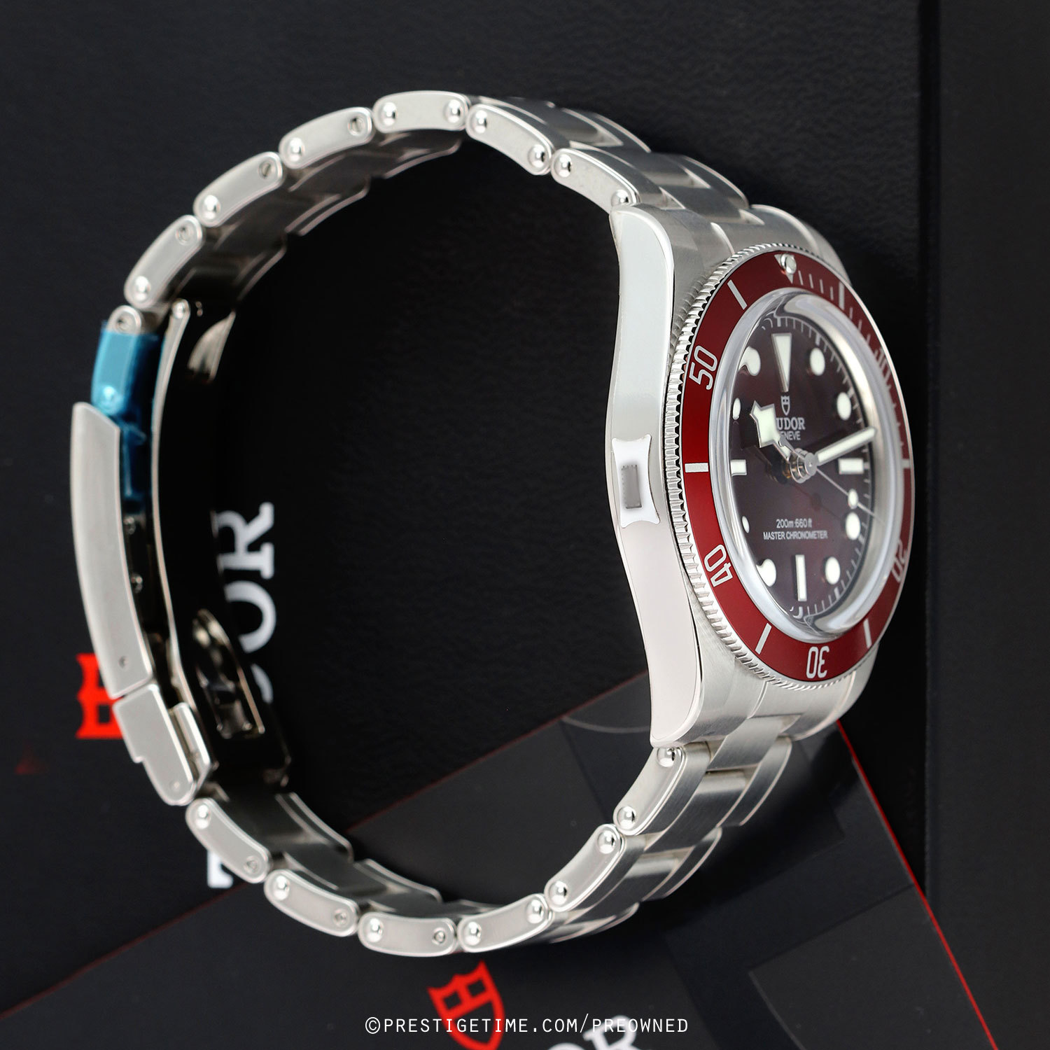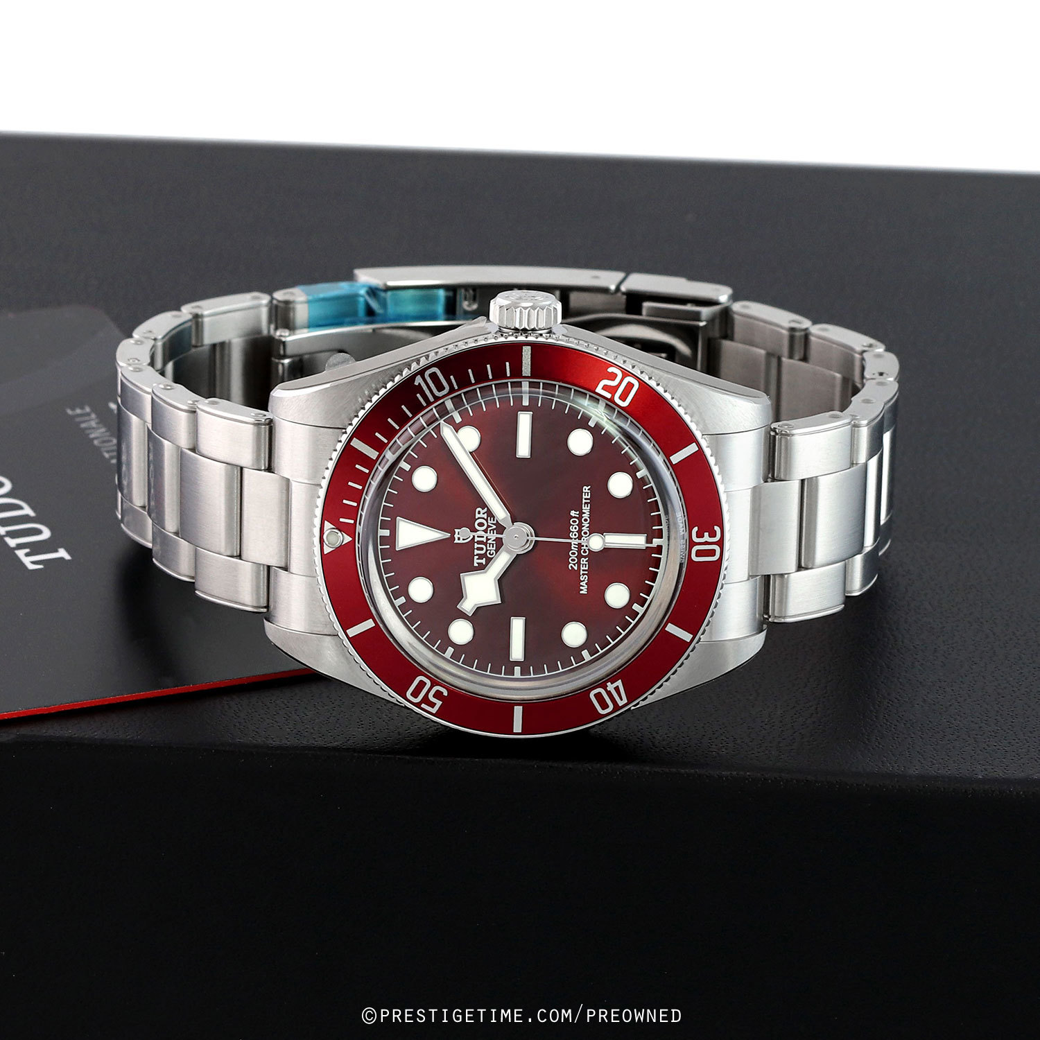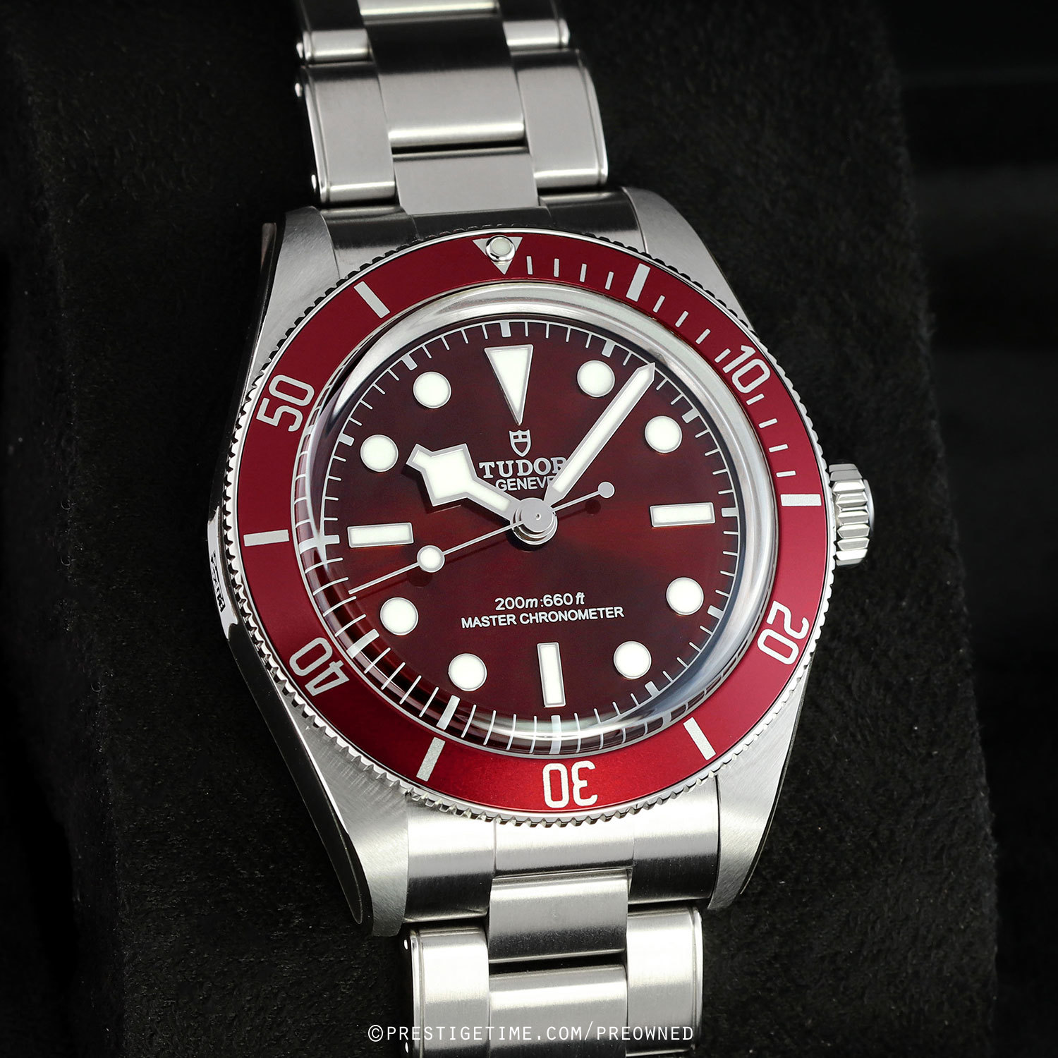 Case: Brushed & polished stainless steel case. Burgundy aluminum bezel with 60 minute diving scale. Crown with the TUDOR rose engraved. Domed sapphire crystal. Slightly domed bright-burgundy dial. Polished angular 'snowflake' hands with luminous fill. Applied polished hour markers with luminous fill. Fine printed minute/seconds track.