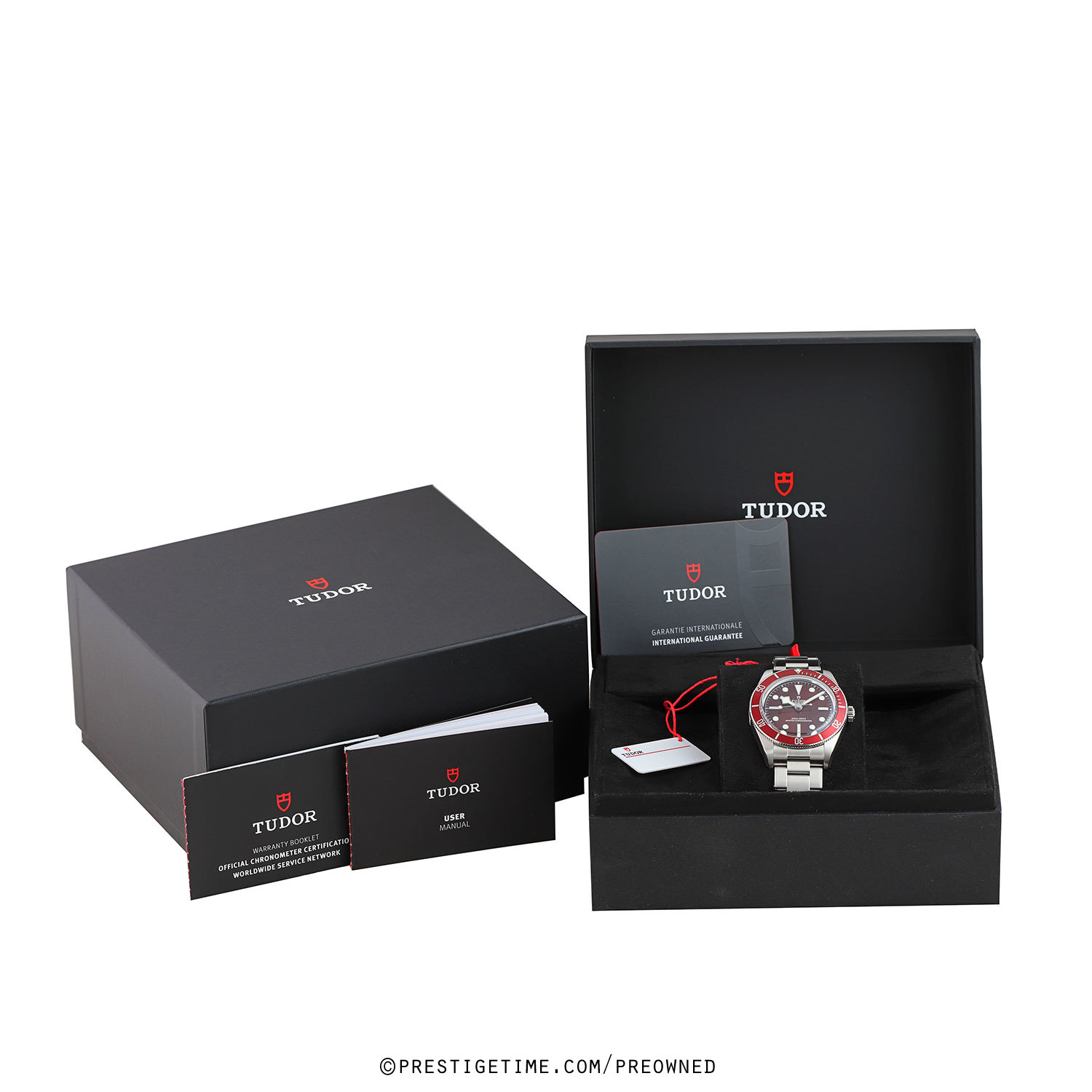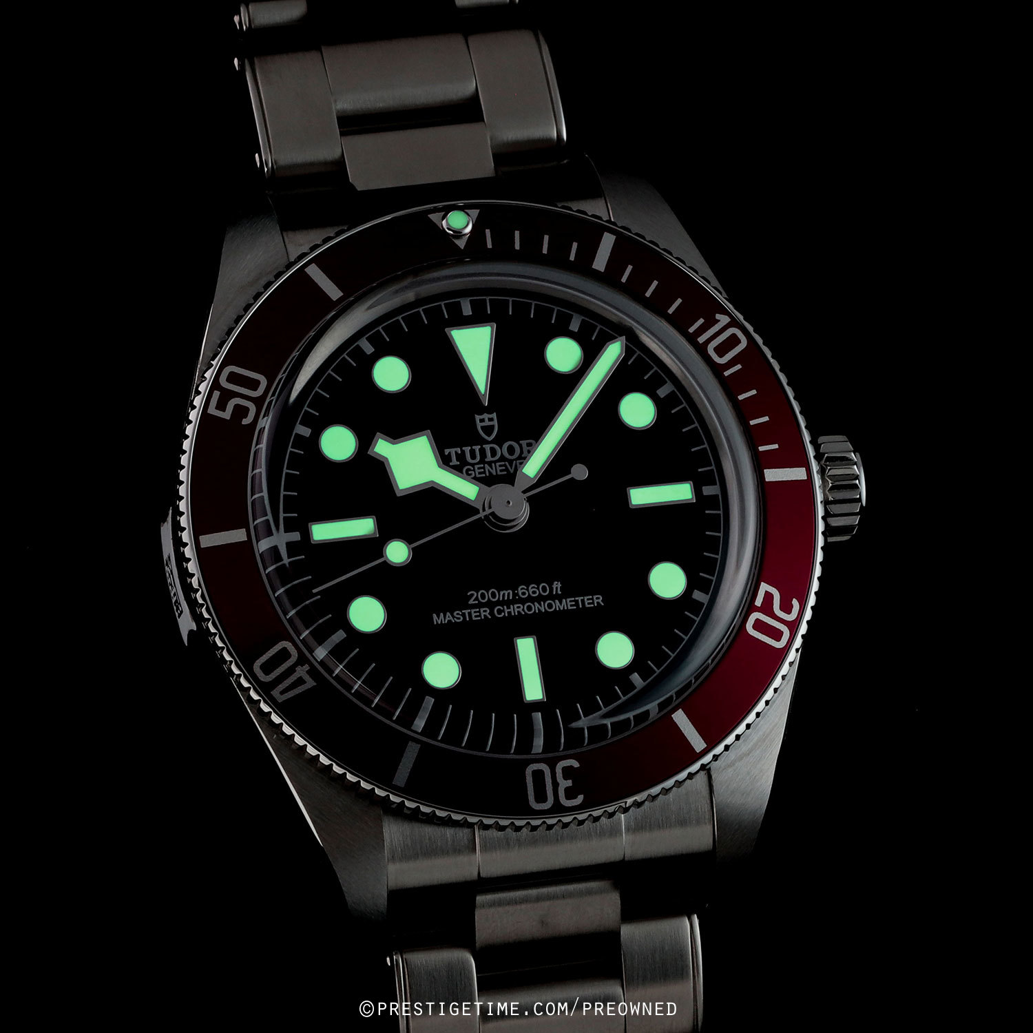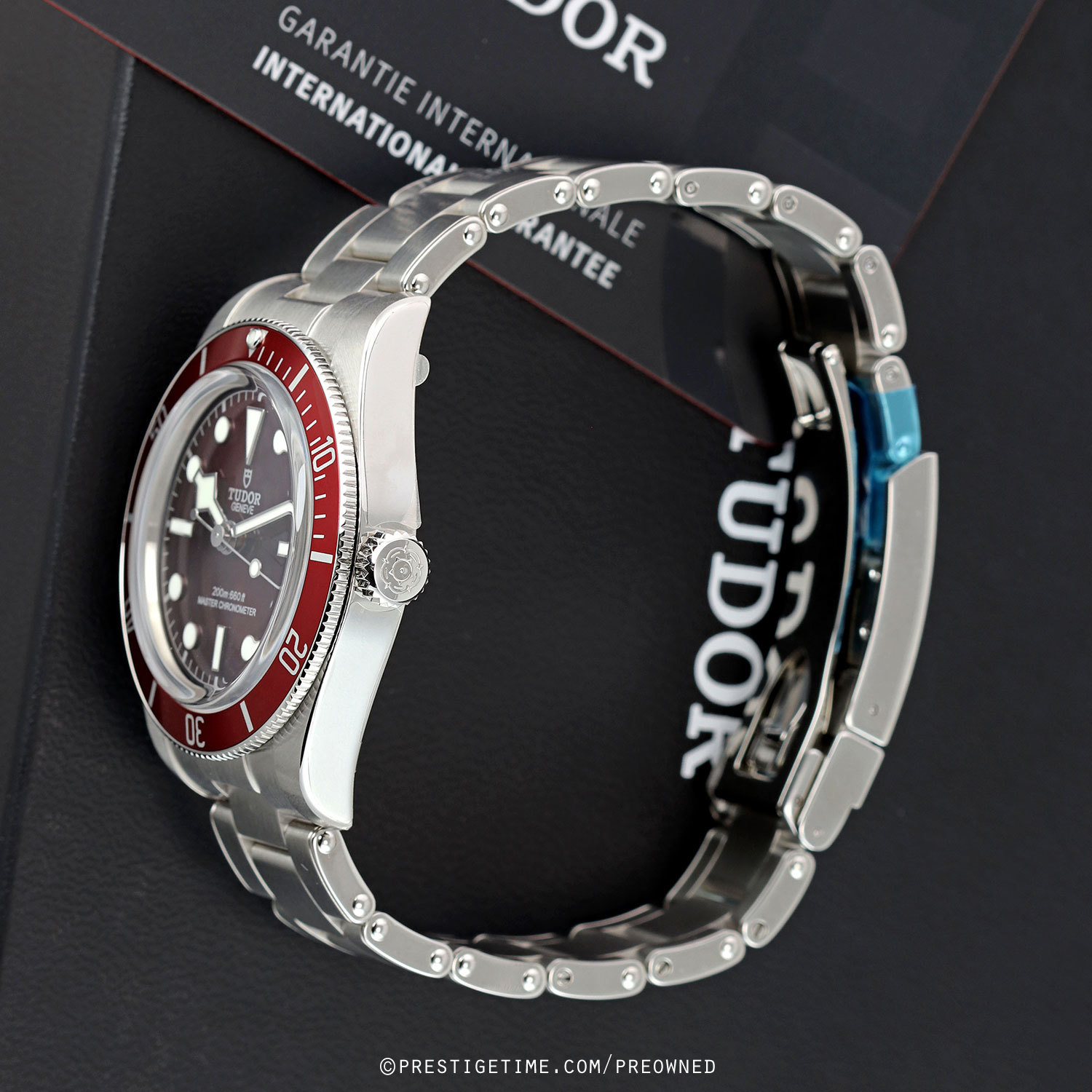 Case: Brushed & polished stainless steel case. Burgundy aluminum bezel with 60 minute diving scale. Crown with the TUDOR rose engraved. Domed sapphire crystal. Slightly domed bright-burgundy dial. Polished angular 'snowflake' hands with luminous fill. Applied polished hour markers with luminous fill. Fine printed minute/seconds track.