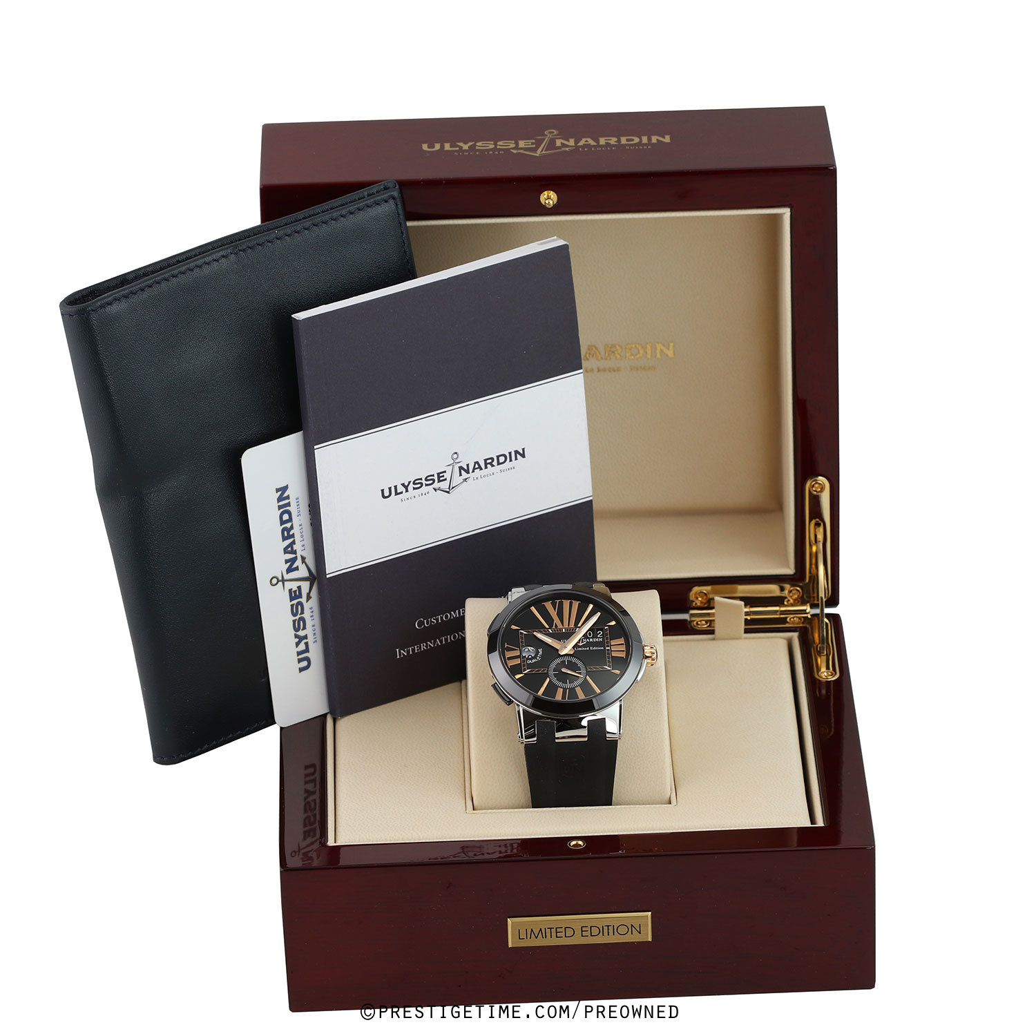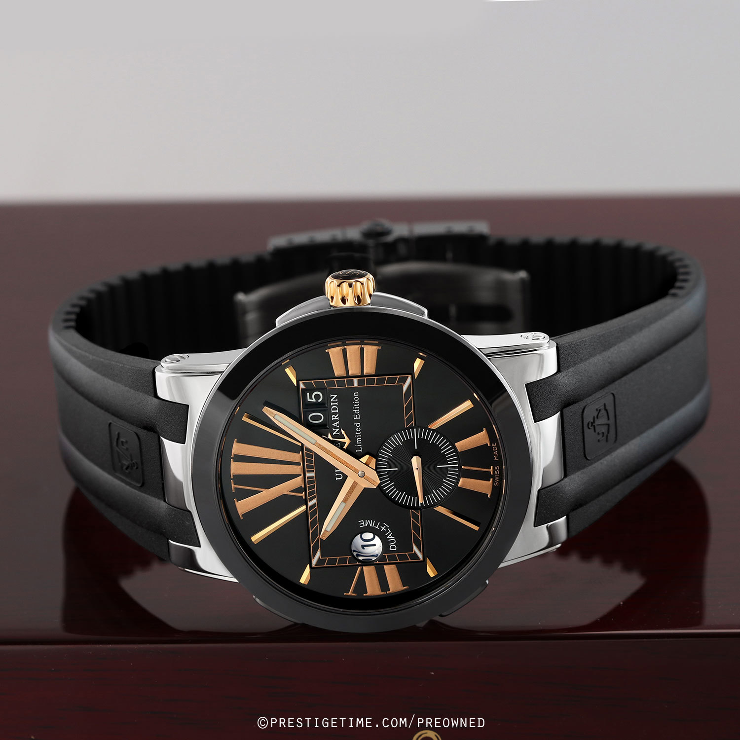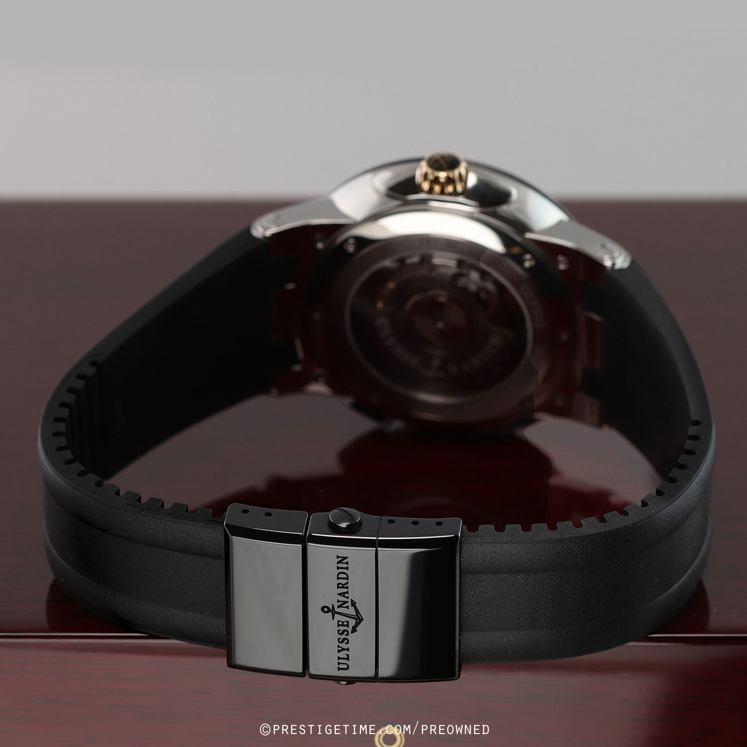 Strap: Fitted on its original Ulysse Nardin black rubber strap with a push-button black ceramic & titanium deployant buckle. The strap is at full length & will fit up to a 9" wrist. The strap will in all likelihood need to be cut down to size.