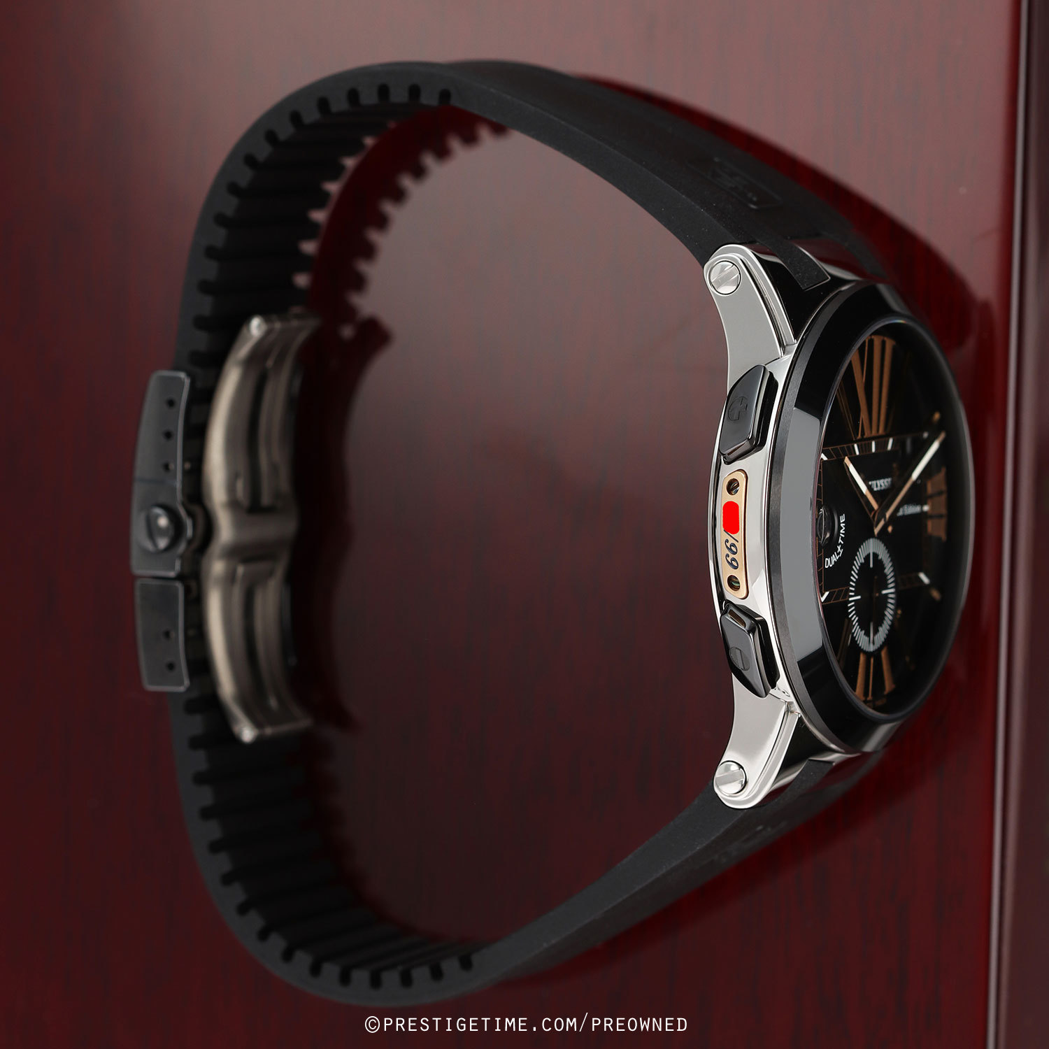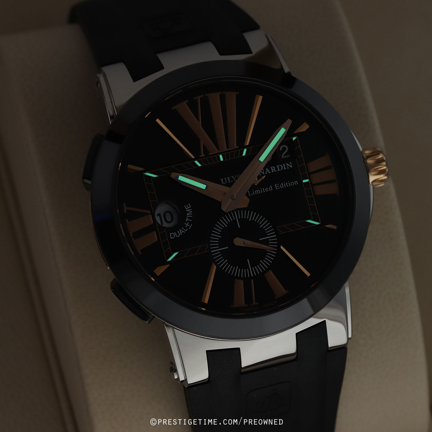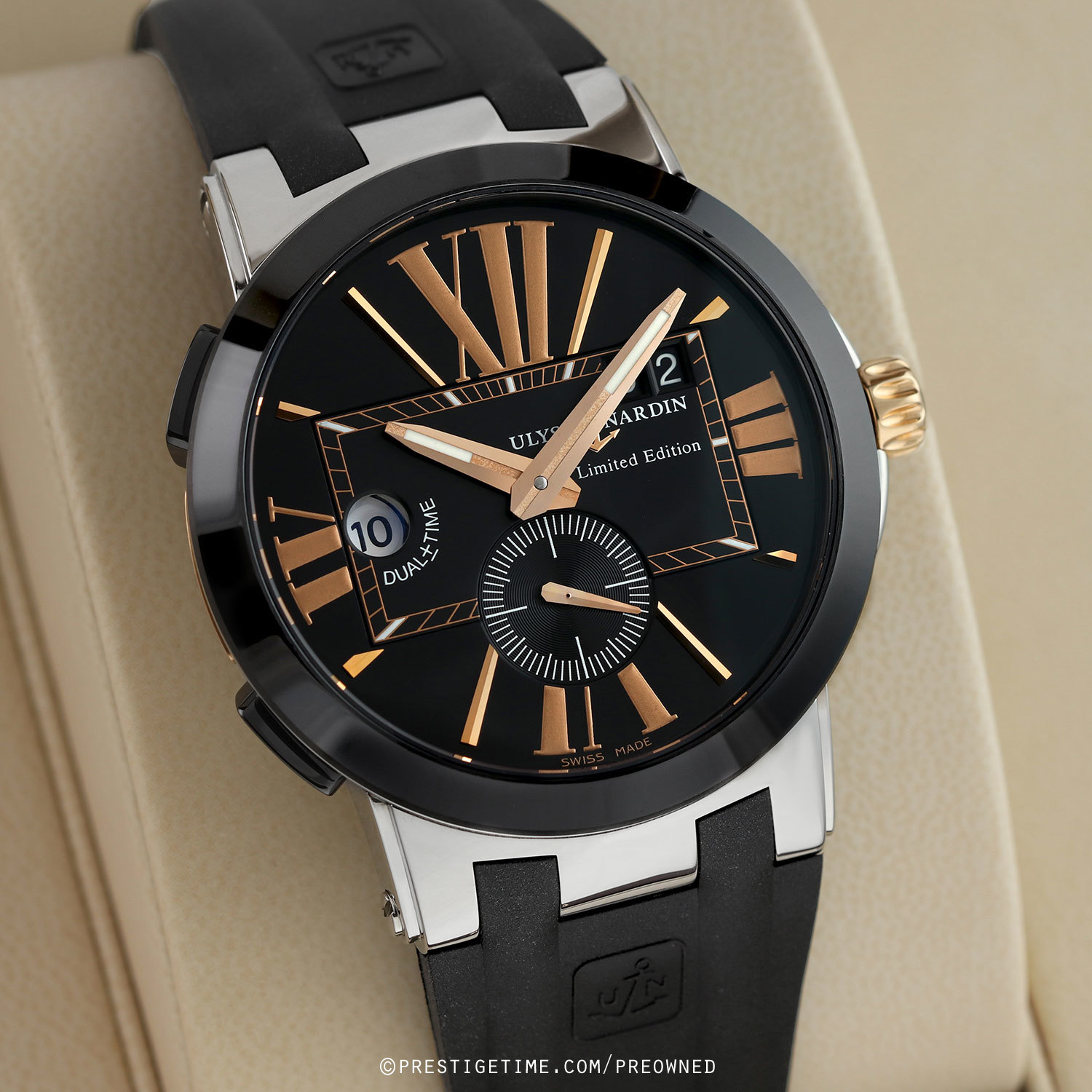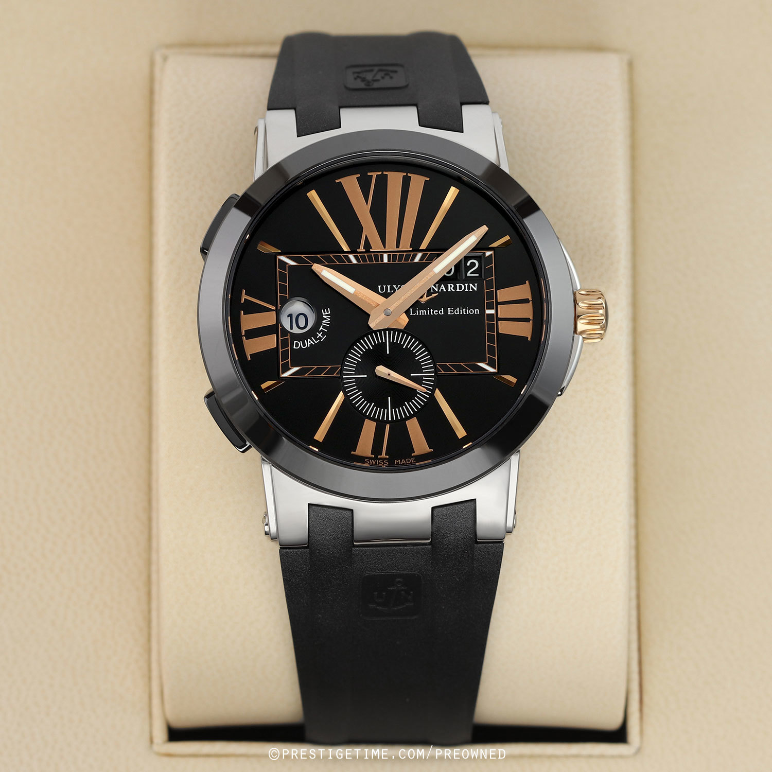 Strap: Fitted on its original Ulysse Nardin black rubber strap with a push-button black ceramic & titanium deployant buckle. The strap is at full length & will fit up to a 9" wrist. The strap will in all likelihood need to be cut down to size.