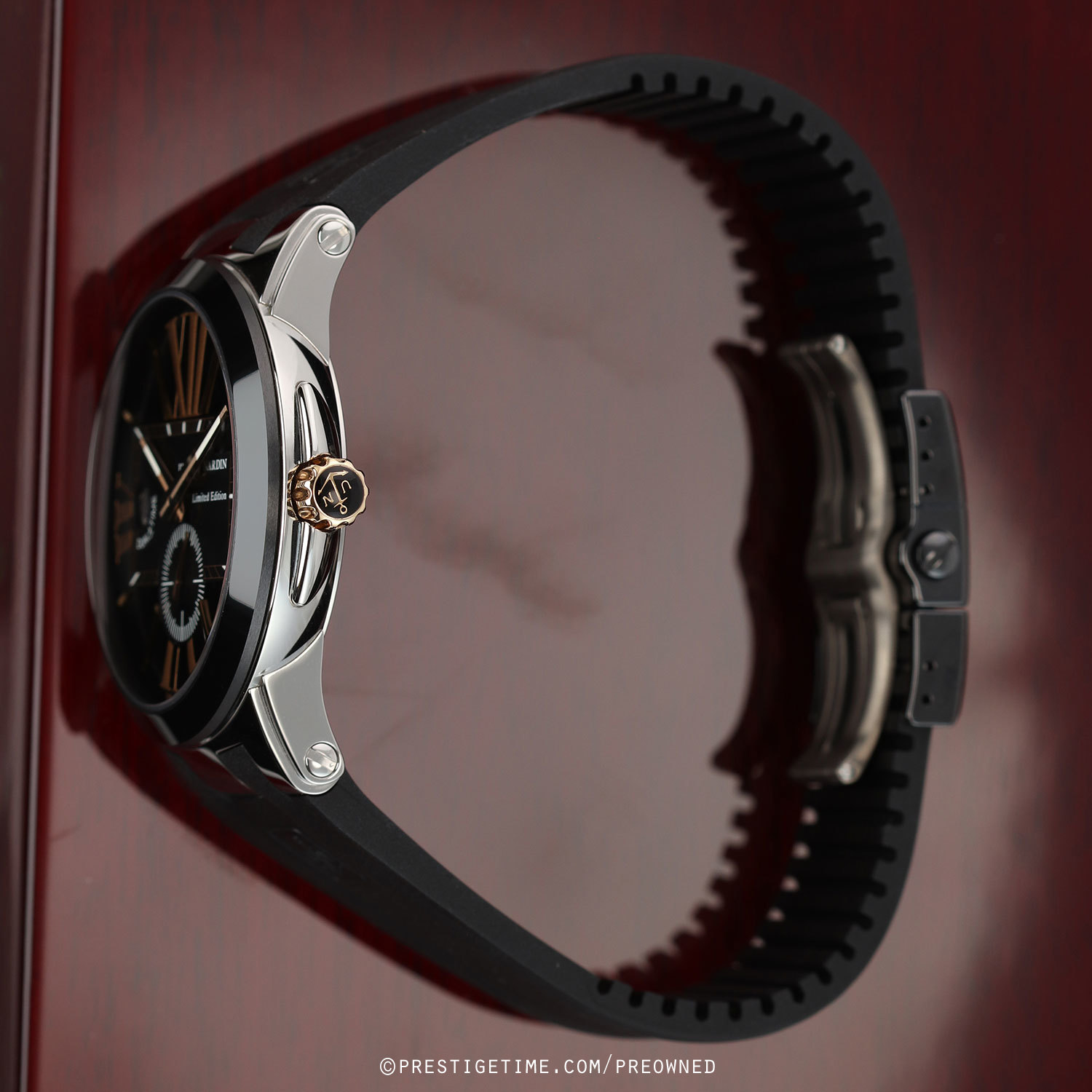 - The dual time can easily be set by advancing or reversing the central hour hand via the black ceramic +/- buttons on the left side of the case.