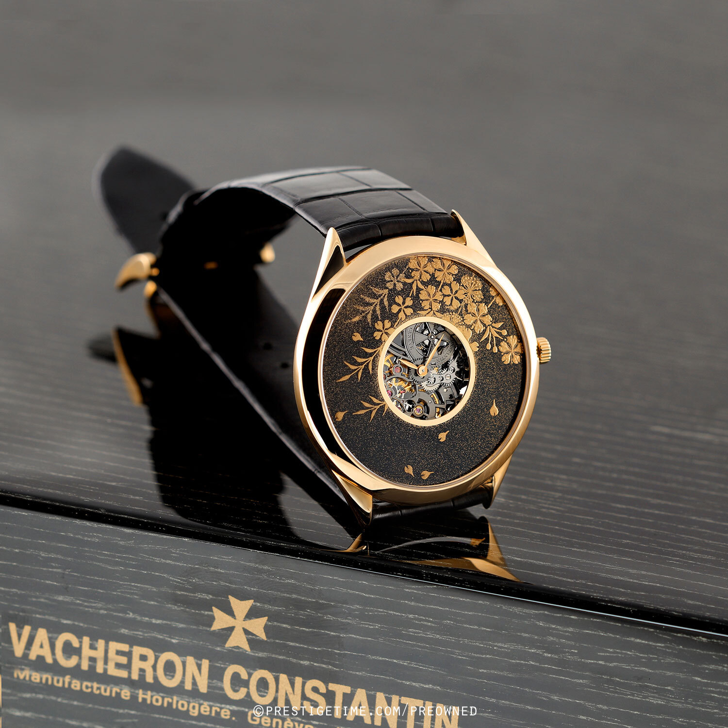 Case: Polished 18kt rose gold case. Black decorated enameled front & black dial. Central dial cutout on both the front & back dials for a partial view of the skeletonized movement. Polished rose gold hands.